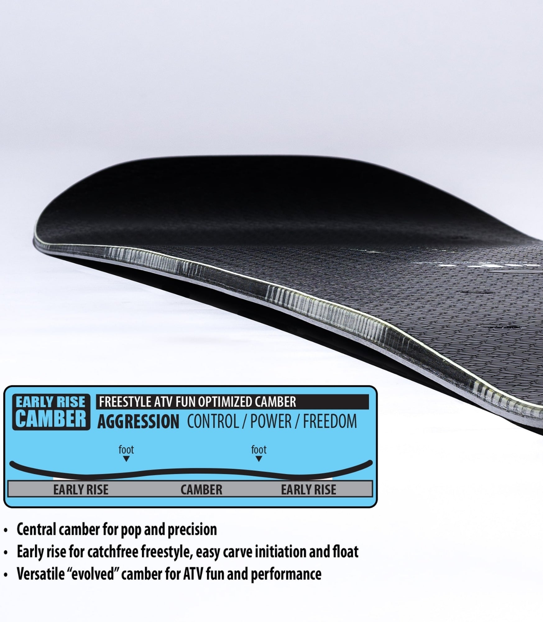 Early Rise Camber – Traditional camber with catch-free, floaty, carvy, early rise tips and tails.