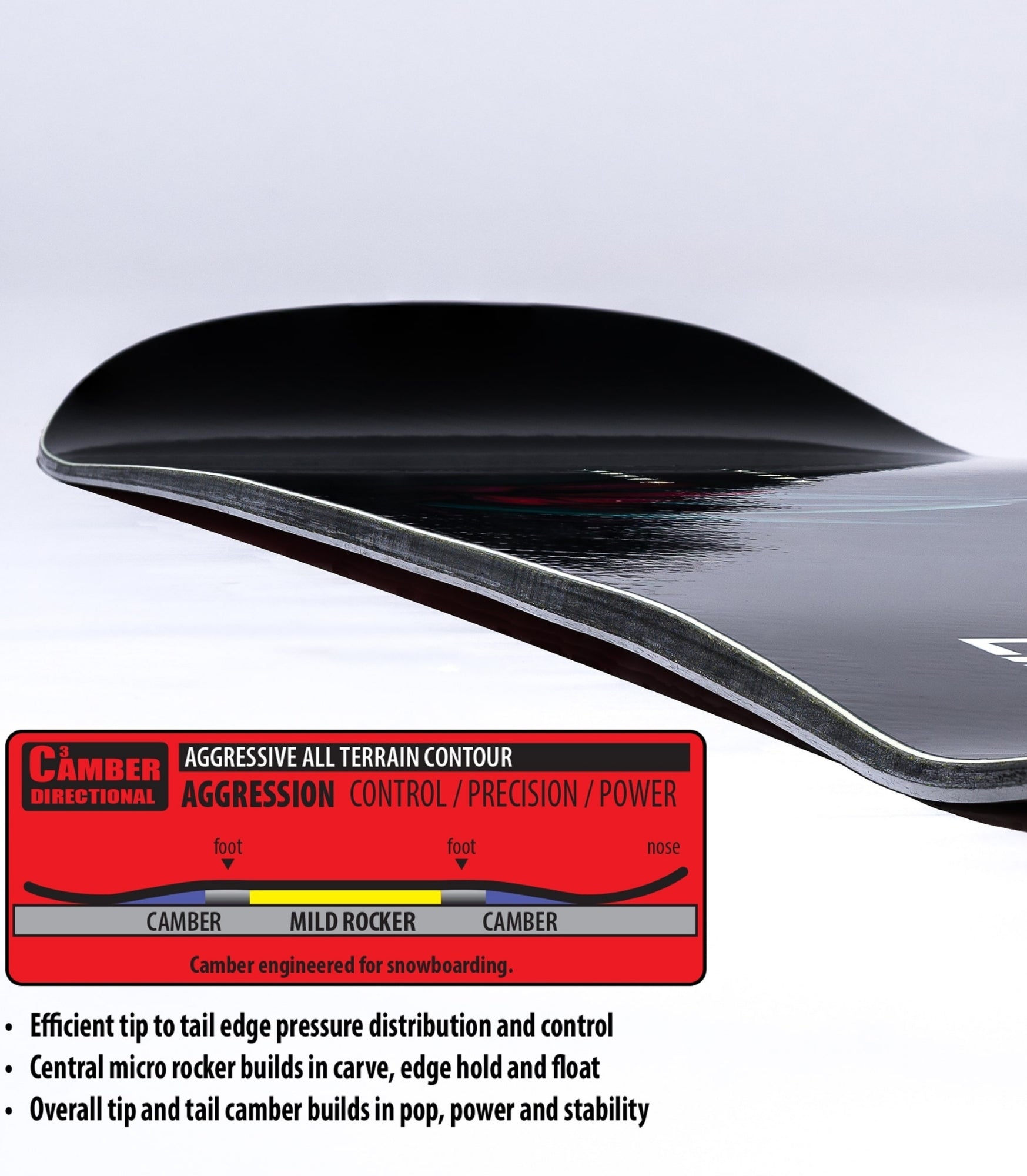 Camber Directional – Camber Hybrid Technology. Full contact and control in all conditions, "Awesome Everywhere". Central rocker builds in carve, edge hold & float, while cambers build in pop, stability and control.