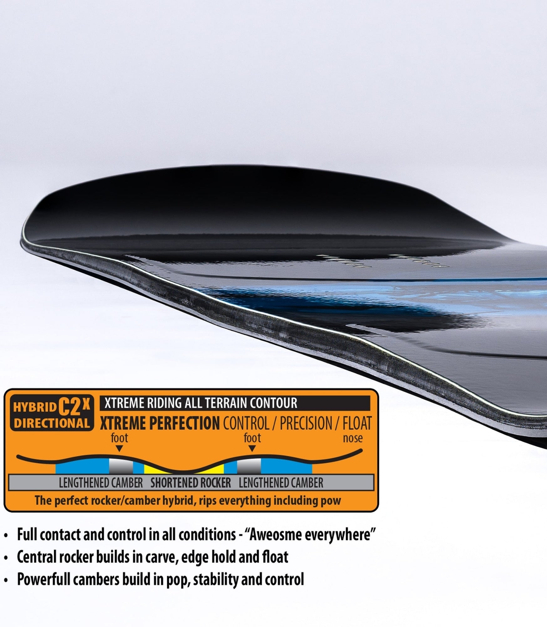 Hybrid C2x Directional – Full tip and tail contact and control in all conditions. Central Rocker engages the middle of the board between the feet, improves edge pressure distribution, and adds float and freedom in soft snow. Camber adds pop, power, liveliness, precision, and control.